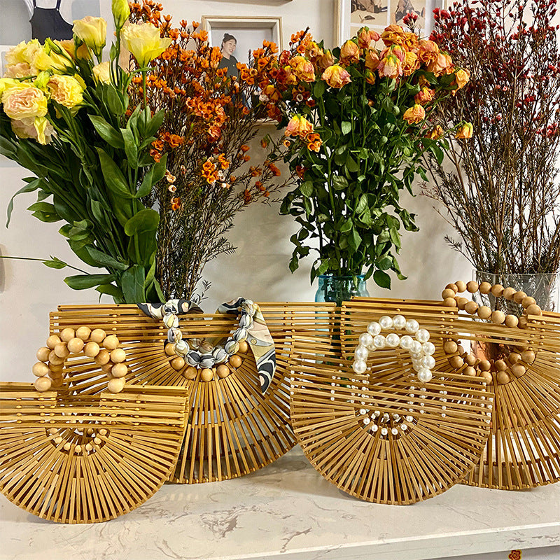 Women's Woven Mori Style Fashion Large Capacity Pearl Wooden Bags